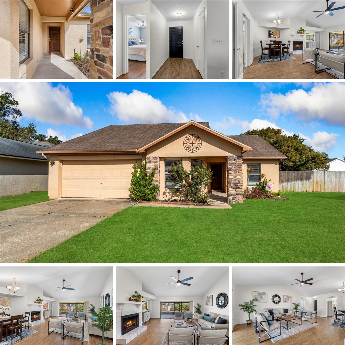 Welcome to this beautifully updated home where style, comfort, and functionality come together effortlessly. The expansive open-concept living and dining area creates an ideal space for both everyday living and entertaining, highlighted by rich wood flooring throughout and a cozy fireplace anchoring the generous living room. The updated kitchen is a true chef’s dream, featuring modern finishes, ample workspace, and a charming eat-in breakfast nook—perfect for casual mornings or gathering with family and friends. Retreat to the serene owner’s suite, a gorgeous haven designed for relaxation. The updated ensuite bathroom offers double vanities, stunning tilework, and a spa-like feel. Two additional bedrooms are generously sized, providing comfort and flexibility for family, guests, or a home office. Ideally located, this home also offers a private backyard oasis with a covered lanai—an inviting space to unwind, entertain, or enjoy peaceful weekends outdoors. With plenty of room to relax and thoughtful updates throughout, this home truly has it all.