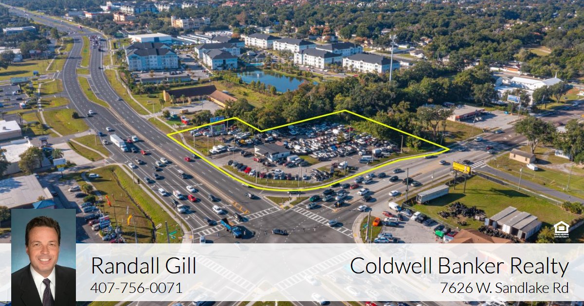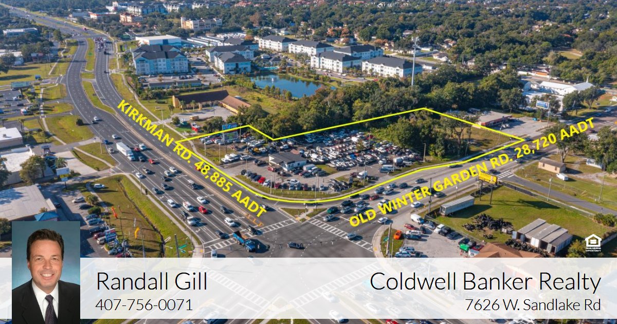 Fantastic 2.03 acres of Commercial Property at the major intersection of S. Kirkman Rd and Old Winter Garden Rd in Orlando. The property offers 359+ ft of frontage on busy S. Kirkman Rd and 428+ ft of frontage on Old Winter Garden Rd. There is a curb cut on Kirkman Rd and two on Old Winter Garden Rd. The property consists of multiple parcels including Tax ID 30-22-29-2940-00-30 (1.77 acres) and Tax ID 36-22-28-4492-00-130 (.26 acres) for a Total of 2.03 acres. The 1.77 acre parcel is currently operating as a car dealership with AC-1 zoning and the .26 acre parcel is vacant with C-1 zoning. Both zonings allow for many Commercial Uses. It is rare that a parcel at such a major intersection in Orlando becomes available. Contact the listing Broker today for additional information and to schedule a showing.