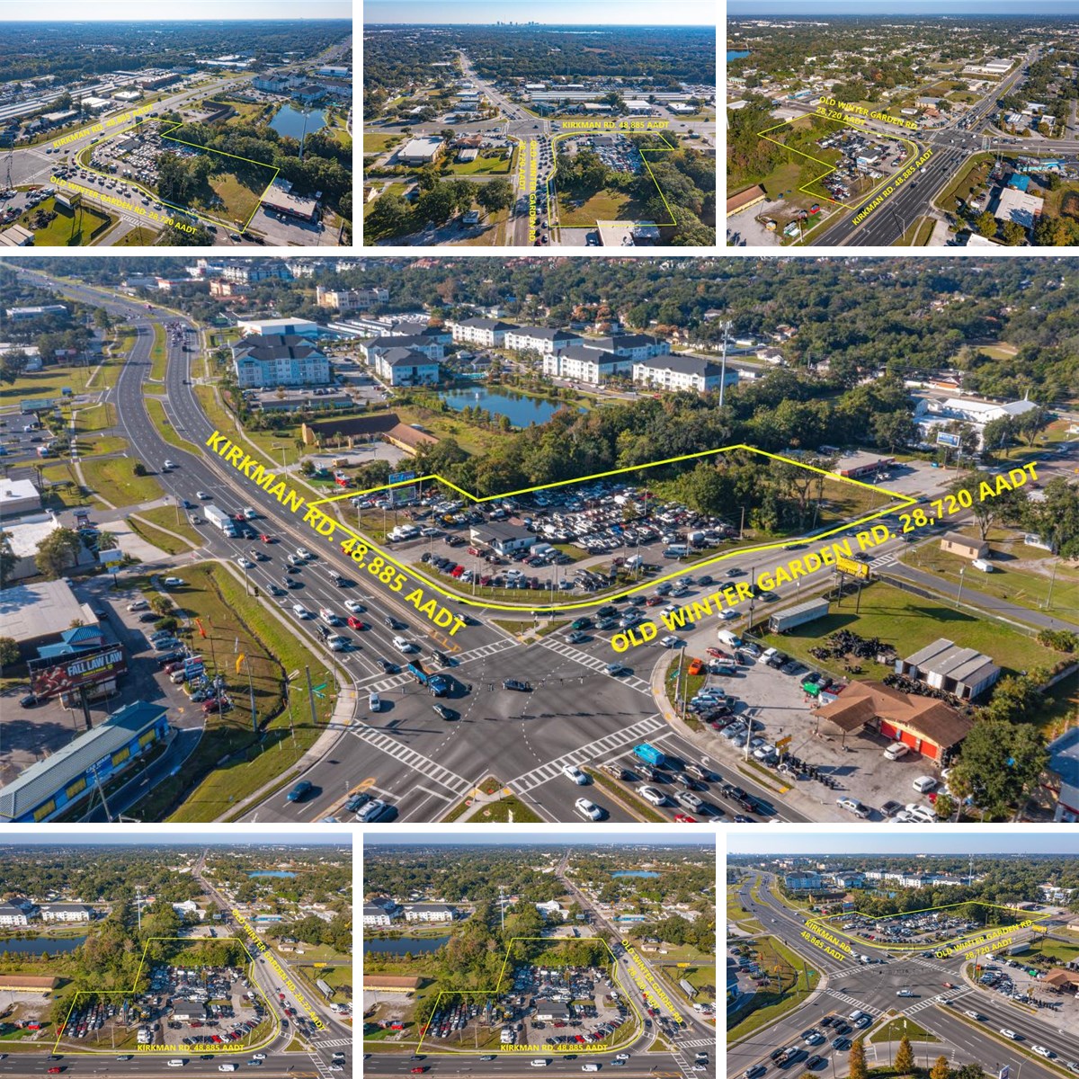 Fantastic 2.03 acres of Commercial Property at the major intersection of S. Kirkman Rd and Old Winter Garden Rd in Orlando. The property offers 359+ ft of frontage on busy S. Kirkman Rd and 428+ ft of frontage on Old Winter Garden Rd. There is a curb cut on Kirkman Rd and two on Old Winter Garden Rd. The property consists of multiple parcels including Tax ID 30-22-29-2940-00-30 (1.77 acres) and Tax ID 36-22-28-4492-00-130 (.26 acres) for a Total of 2.03 acres. The 1.77 acre parcel is currently operating as a car dealership with AC-1 zoning and the .26 acre parcel is vacant with C-1 zoning. Both zonings allow for many Commercial Uses. It is rare that a parcel at such a major intersection in Orlando becomes available. Contact the listing Broker today for additional information and to schedule a showing.