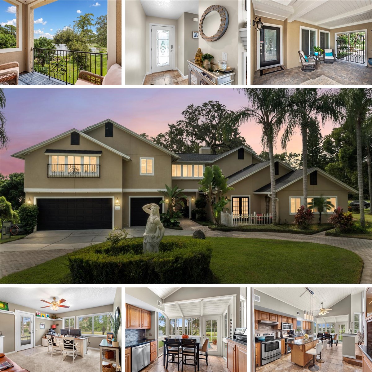 HAVE YOU DREAMED OF LIVING ON A PRIVATE LAKEFRONT HOME ON HALF AN ACRE- THIS IS THE ONE! do you enjoy entertaining? This Custom home feature 5 spacious Bedrooms/3 Baths, Saltwater pool and is located on a quiet Cul-De-Sac Just off Maitland Blvd. This is the ideal home for you if you work from home and meet with clients as it has a separate outside entrance to this office and plenty of parking in the circular drive. What a view entering from the iron Portico breezeway to the front door and Foyer, there you will fall in love with the Open Floor Plan, Natural Lighting throughout this home, along with the gorgeous views of Lake Bosse from many rooms. When you are ready to relax walk upstairs to your Primary 36x14 spacious Bedroom retreat that offers a private walkout Balcony to sit outside and enjoy the views of nature and the lakefront and a has a gas fireplace. The primary bedroom also has oversized dual walk-in Closets, a sitting area to unwind from the day, and a bonus area (loft) that is used as a library or an area that could be used for a gym. The Primary bath has dual sinks, separate shower, Garden Tub, built in drawers, and a water closet. If you enjoy cooking you will love the Granite Countertop work space, The island, Walk in Pantry, Coffee Bar, Stainless Appliances, that include Refrigerator, dishwasher, range, Microwave, Wine Cooler, plenty of storage, and a Eat-in breakfast area to enjoy your morning coffee overlooking the lake and the pool, and manicured grounds. A downstairs 3rd bedroom would be a perfect Mother-in-Law suite as it has its own private Bath, and a nice screened Patio to enjoy sitting outside. The open Family Room is a perfect place to gather with a Fireplace, Cathedral Ceilings, and has lovely upgraded Porcelain tile floors with the look of distressed wood, that flows into the Living Room, Kitchen and Dining Room. The Living Room and Dining area both overlook the breathtaking Lakefront, Screened in Saltwater Pool, Heated Spa and Patio to enjoy the outdoors.