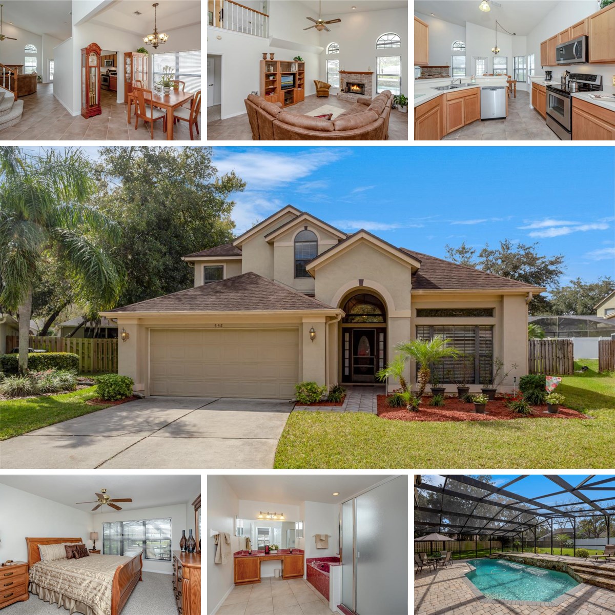 Stunning 4/5 BEDROOM, 2 ½ BATH, executive, POOL HOME located on TREE LINED CUL-DE-SAC in Oviedo’s DESIRABLE KINGSBRIDGE WEST community with SEMINOLE COUNTY A RATED SCHOOLS. Step inside to a fabulous OPEN FLOOR PLAN with NUMEROUS ADDITIONAL FEATURES including ALL NEW INTERIOR PAINT, SOARING VOLUME CEILINGS, UPGRADED TILE FLOORS, TRANSOM WINDOWS, UPGRADED FIXTURES IN MANY ROOMS, CUSTOM ACCENT SHELF IN GREAT ROOM, CUSTOM BANNISTER ON STAIRS and PADDLE FANS THRU-OUT. The OVERSIZE GREAT ROOM with handsome BRICK, WOOD BURNING FIREPLACE and CUSTOM WOOD MANTLE is open to an inviting kitchen with STAINLESS STEEL APPLIANCES, TONS OF CABINETS and COUNTER SPACE plus CLOSET PANTRY. A generous FORMAL DINING ROOM off the kitchen along with the LARGE KITCHEN DINETTE AREA with BAY WINDOWS makes entertaining a breeze. This SPLIT PLAN HOME has the MASTER BEDROOM and EN-SUITE DOWNSTAIRS along with a DEN/5TH BEDROOM, ½ bath and FULL SIZE LAUNDRY ROOM. UPSTAIRS is another FULL BATH and 3 NICE SIZE BEDROOMS. Enjoy Florida living at its best in this HUGE BACK YARD with SCREENED IN POOL BOASTING SOLAR PANELS FOR HEATING, WATER FEATURES, a HOT TUB and BRICK PAVER DECK with EXTENDED SLATE/BRICK PAVED DECK AREA. COMMUNITY AMENITIES include TENNIS COURTS, PLAYGROUND, GAZEBO, PARK, FISHING PIER on Long Lake and best of all A BACK ENTRANCE DIRECTLY TO OVIEDO ON THE PARK. This fabulous home in a GREAT COMMUNITY and EXTREMELY CONVENIENT LOCATION truly has it all!