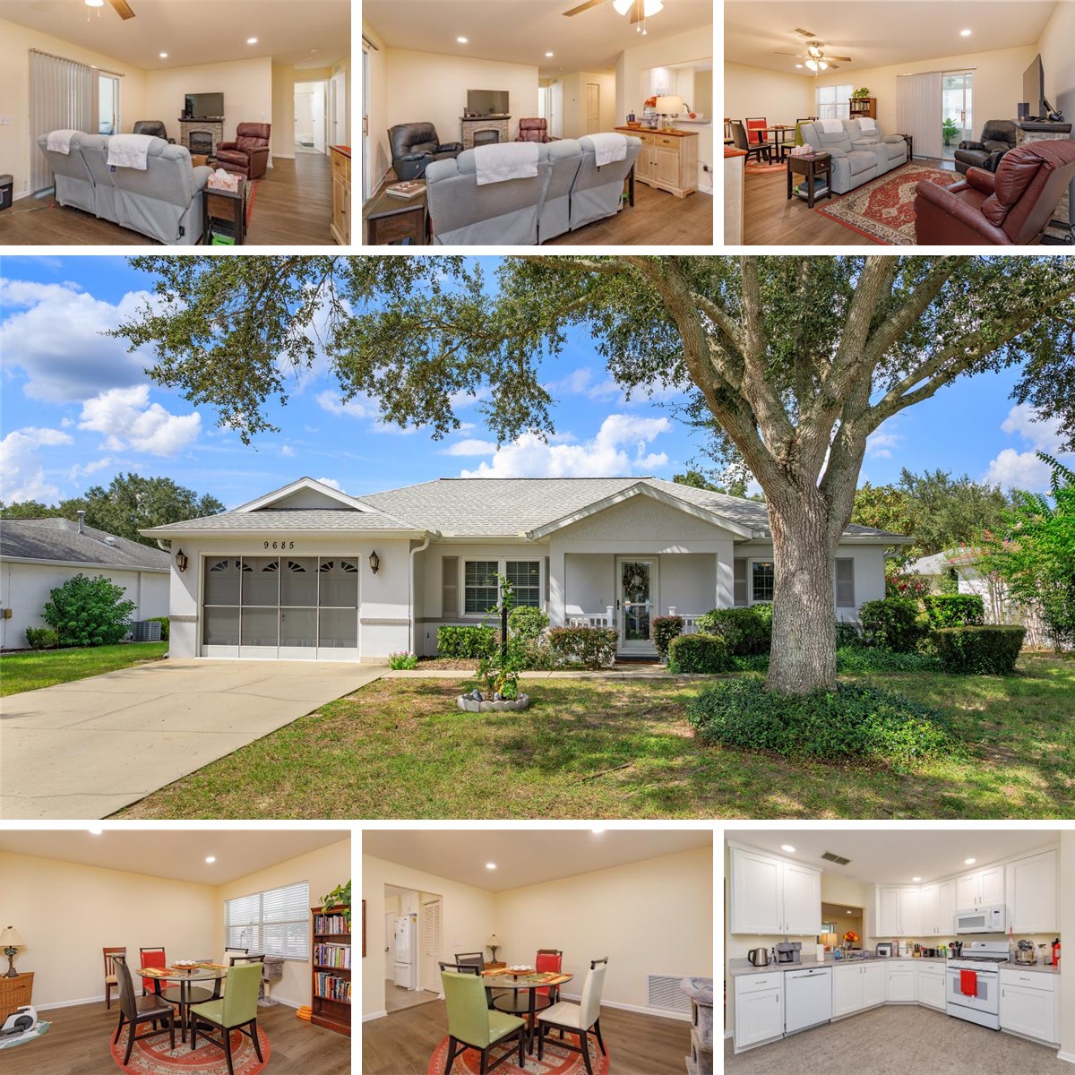 This cute Single Family home is located in the beautiful 55+ community of On Top of the World. This home has great features, a large kitchen with newer cabinets and solid surface counter tops, a gas range, a built in pantry and room to add an island, or have room to dance in the kitchen! There is an entry door to the attached garage, which is huge! The garage is a 2 car, but there is room to park a golf cart, plus additional storage. The garage has access to the newly completed Florida Room at the rear of the home. The primary bedroom has a walk in closet and ensuite bathroom with shower. The 2nd bedroom and bathroom are across the small hallway. The Living Room/Dining Room combination offers a large space to arrange to your liking. There is a small Florida room off of the Living Room, and attached is a brand new, larger Florida Room with access to a pave stone patio and fenced backyard. This home has been nicely updated and worth seeing for all the features!